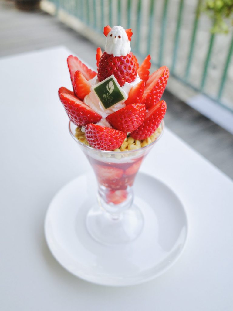 3月〜5月ごろに【観音山フルーツパーラー 総本店】への訪問が叶うならば、ぜひともオーダーしたいのが和歌山県産の新鮮ないちごをふんだんに使った贅沢なパフェ、その名も「和歌山県産春いちごと紀州犬の農園パフェ」。