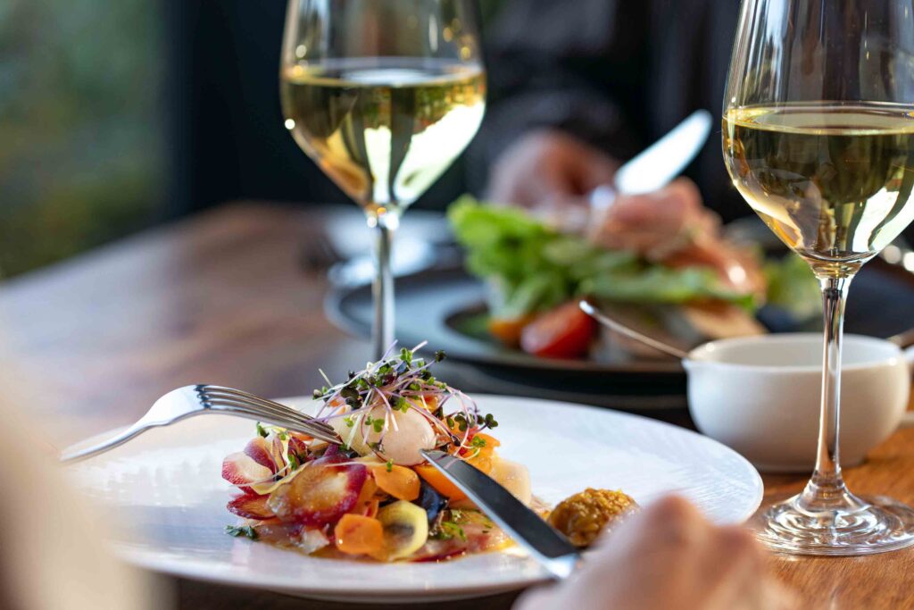 メインダイニングでは、箱根の山の景色を眺めながら、オープンキッチンでシェフによる多彩な西洋料理や世界各国のワインが楽しめます。