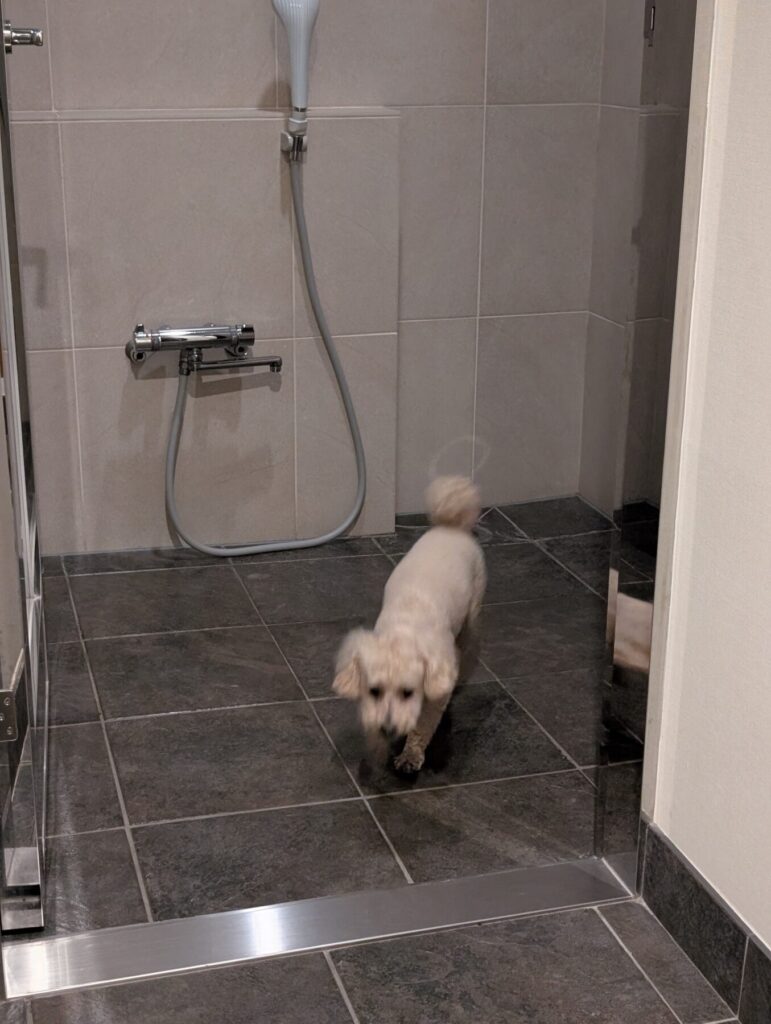 客室入口にあるのはドッグ用シャワー。まずは足をキレイにして、部屋にいれたいという飼い主心にしっかり寄り添ってくれています。