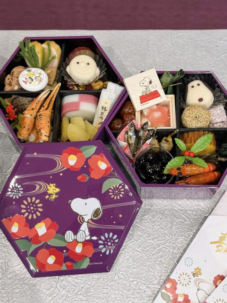 スヌーピーと和柄の組み合わせがシックな六角形の重箱に詰められているのは、スヌーピーとチャーリー・ブラウンを模した練り切りや、かに爪、真鯛幽庵焼、豚角煮、数の子といった伝統的な食材。