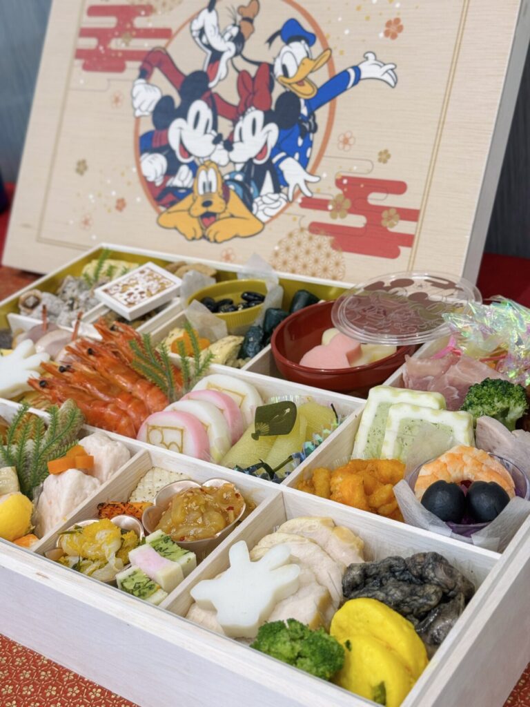 具材に関しては、ともにチャーミングなシルエットかまぼこやミッキーマウスのフロマージュをはじめ、味付け数の子、栗きんとんにつぶ貝真砂和え、牛肉笹包みといった本格的でお祝いのひと時に最適なラインナップ。