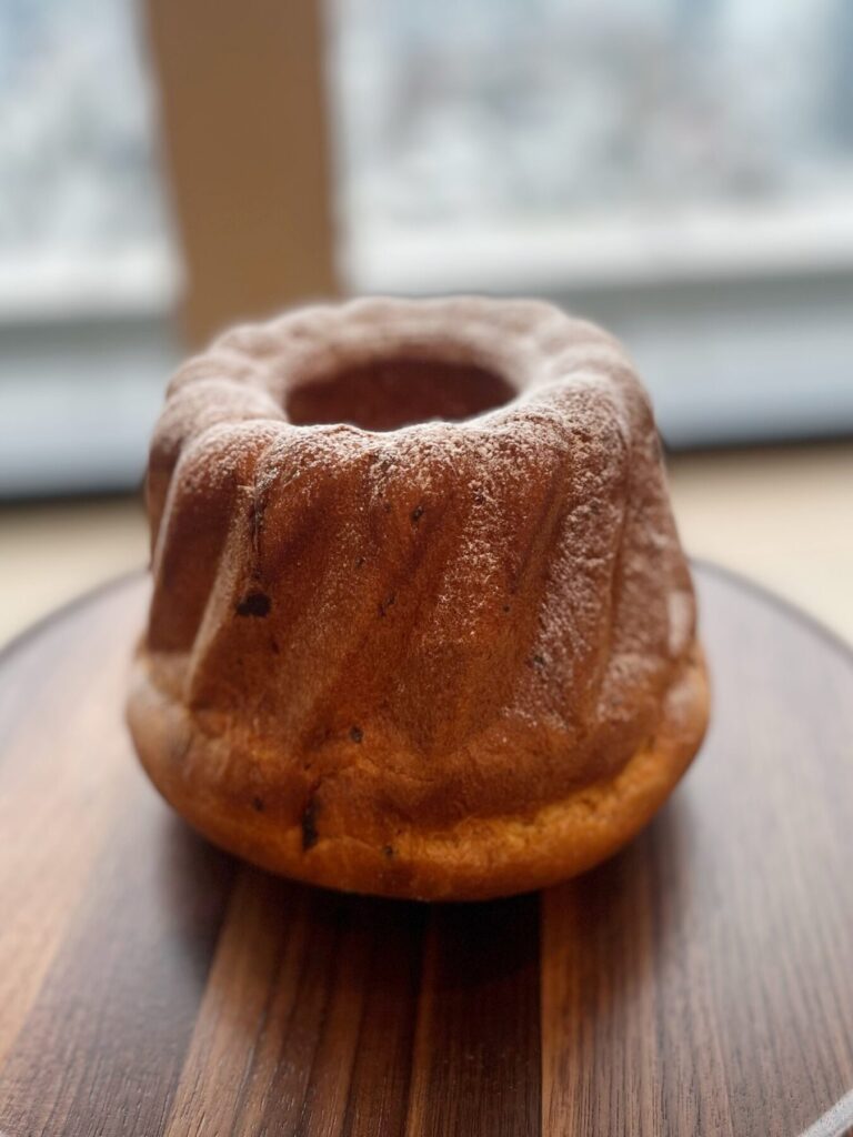 紅茶にもよく合う「クグロフ」は、黒富士ファームの平飼い卵を用いた生地に、レーズン、オレンジピール、アーモンド、オレンジブロッサムが練りこまれた、しっとりした口当たりの焼き菓子。