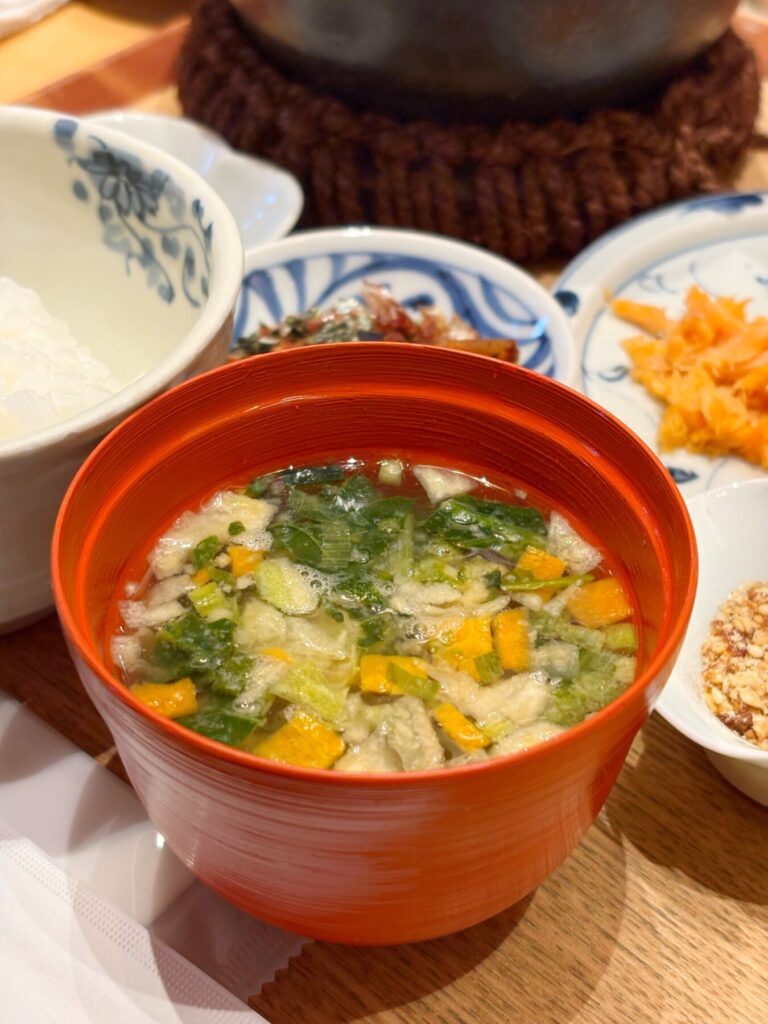 具だくさんの味噌汁で、キャベツやかぼちゃなど野菜の甘みも楽しめます。1食ずつ買えるので、色々な種類を選んで持参しても。