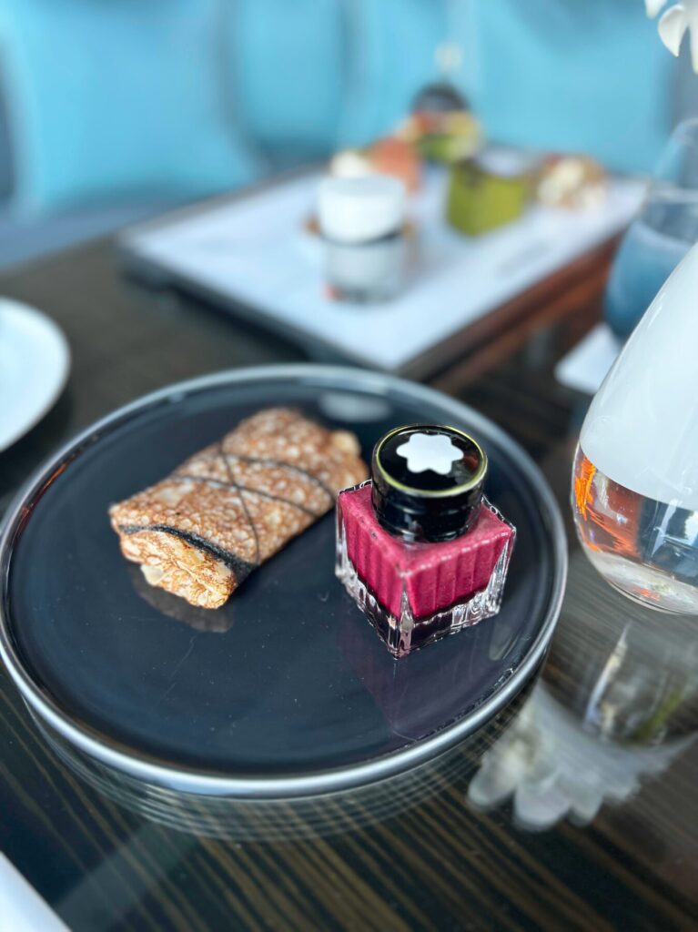 ドレッシングの器は、Montblancの象徴とも言える万年筆のインクボトルをイメージ。