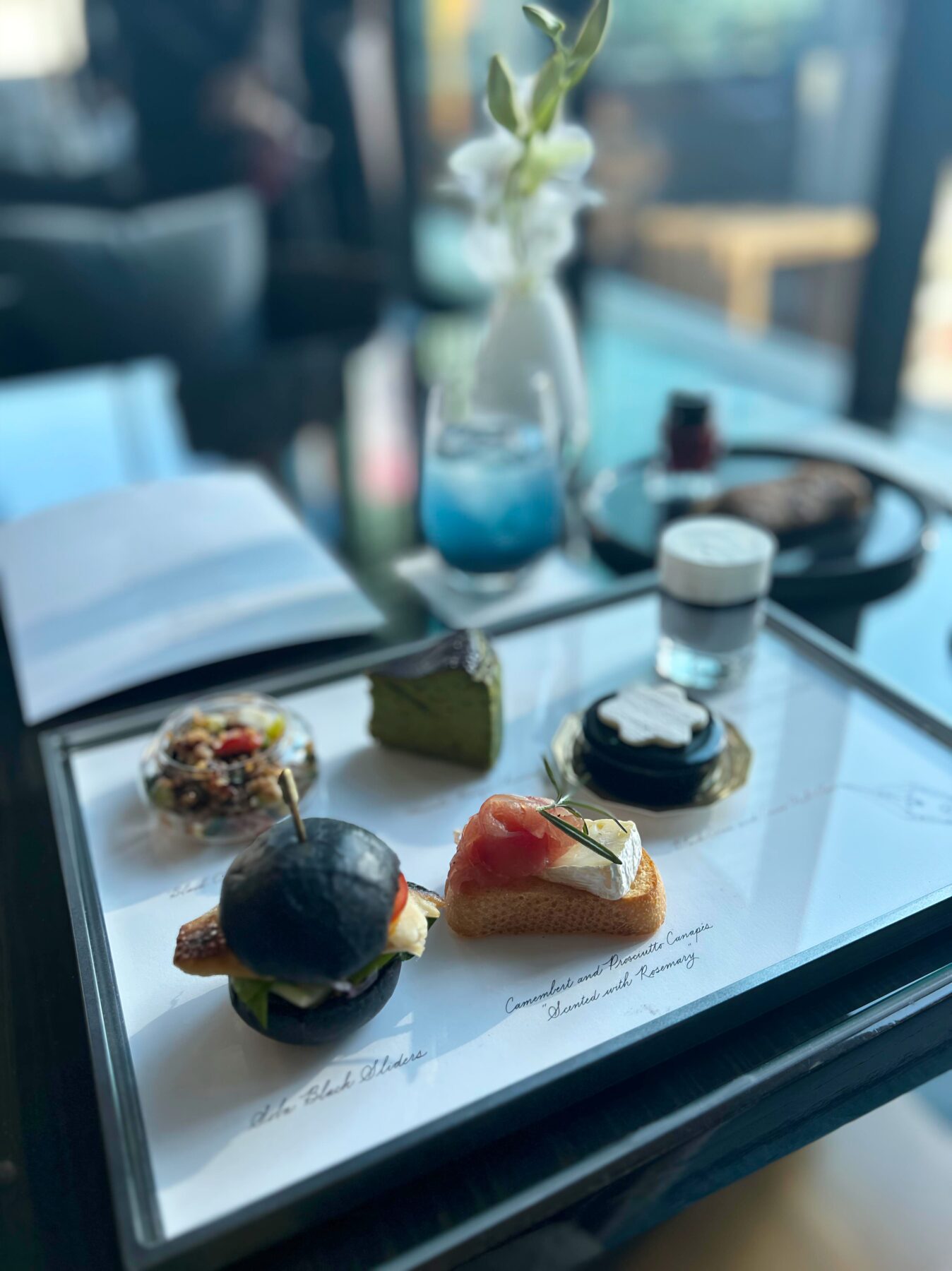 ひらめきと集中力を高めてくれる数種のドリンク、セイボリー、デザートたち。