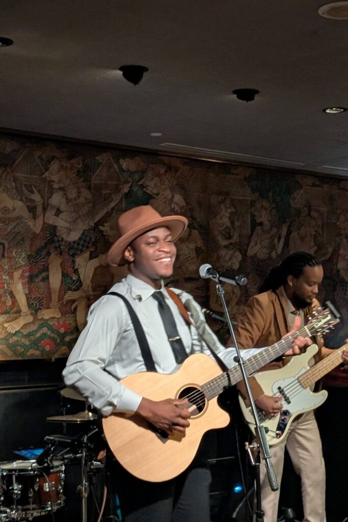 インドネシアの伝統的なワヤンの人形が楽器を奏でる壁画の前のステージでは、月曜日から土曜日まで、毎夜アーティストがライブ演奏を繰り広げます。