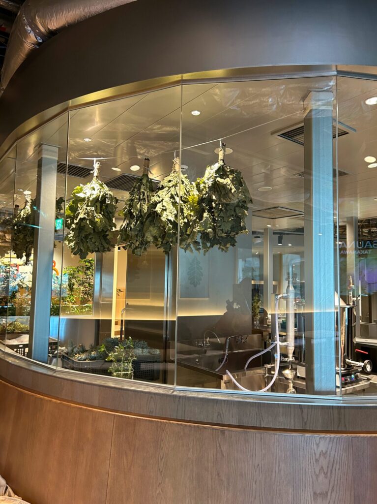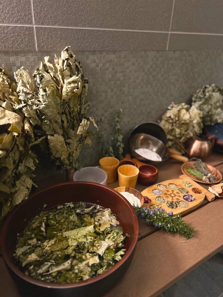 さらに、ここではウィスクを蒸気で温め、身体を優しく叩いたり押し当てたりするリラクゼーション施術「ウィスキング」を唯一体験できるスペース。