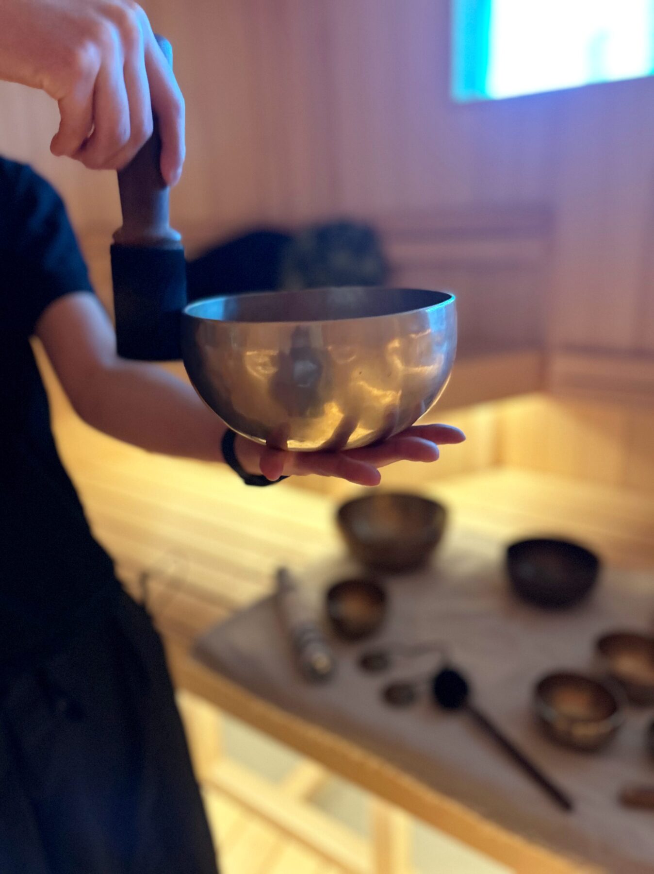 瞑想やヒーリングに用いられる、大小さまざまなサイズのシンキングボウルにティンシャ。