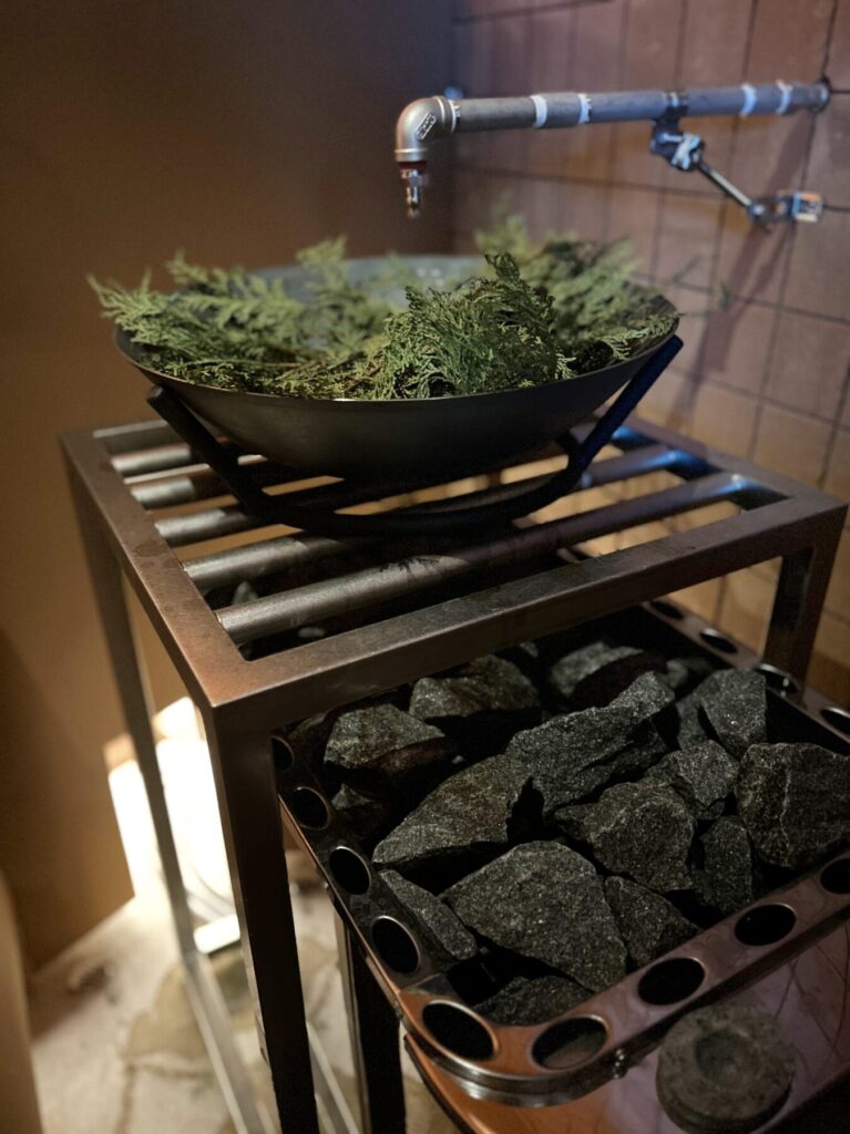 蒸気と共に、新鮮なハーブや季節の草木の香りに包まれるサウナ室「Leaves」(リーブス)。