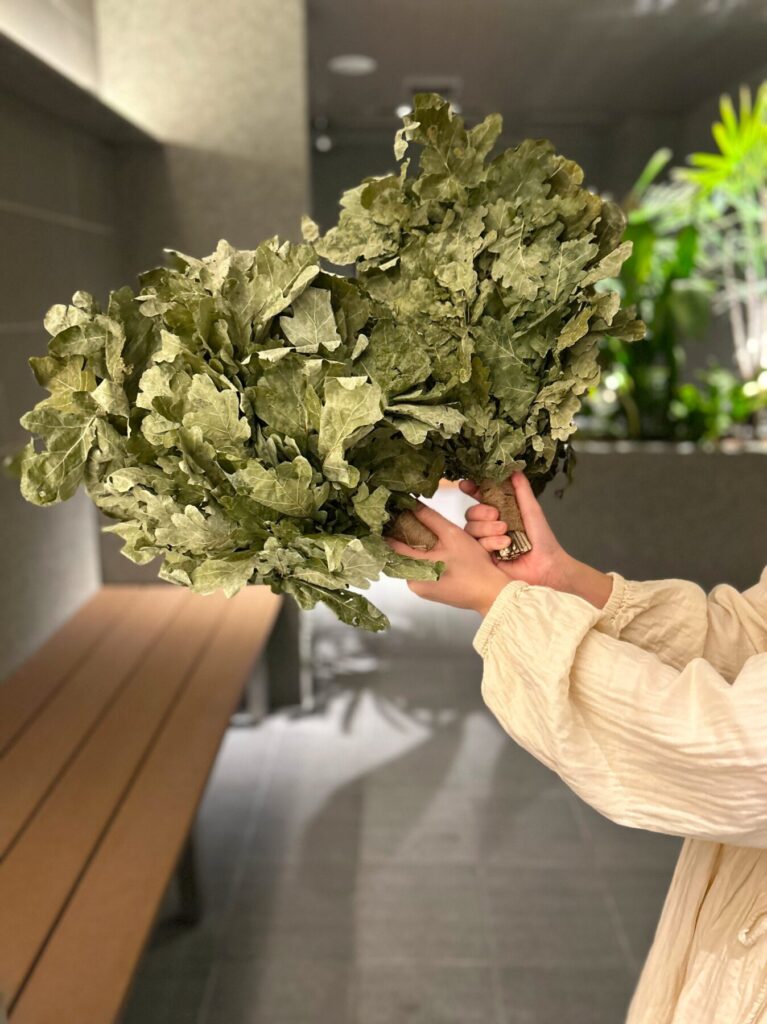さらにLeavesでは、サウナマスターが植物の枝葉をうちわのように束ねた「ウィスク」を扇ぐことによって、フレッシュなハーブの香りと蒸気を楽しむ「ハーバルリトリート」が体験可能。