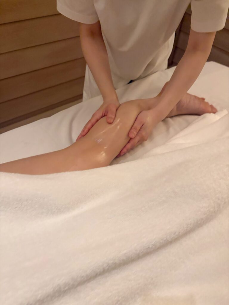 ゼラニウムバスソルトのフットバスから始まり、ツボ押しやスウェディッシュマッサージ、リフレクソロジーまでを組み合わせた流れるような施術で、深いリラックスへと導かれます。